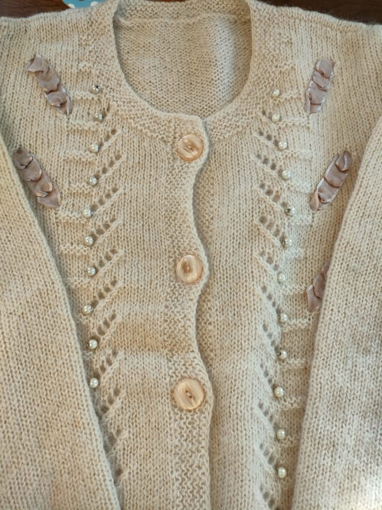 私は母の叔母が手編みしたニットのカーディガンのボタンの付け替え。